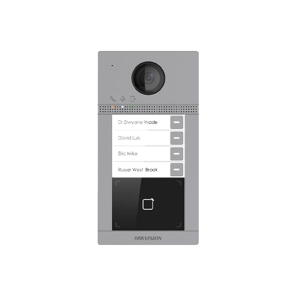 DS-KV8413-WME1 Vanjska portafonska jedinica s četiri tipke 2 MP kamera WDR, BLC, DNR Kut pokrivanja: 129° IR do 3m IP65, IK08 zaštita Čitač mifare kartica RS485, 4 alarmna ulaza, 2 izlazna releja, 10/100 Mbps Ethernet Bežično povezivanje s mrežom Napajanje: PoE/12VDC